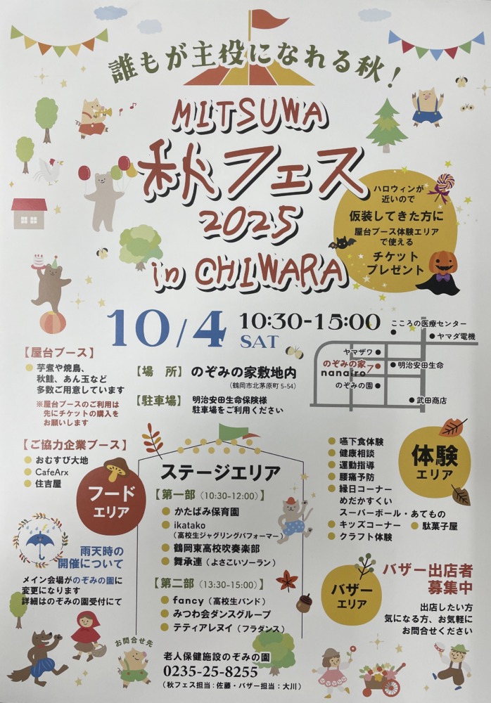 MITSUWA 秋フェス2025 in CHIWARA 開催お知らせ 『繋がる・知る・楽しむ』をテーマに、今年もみつわ会秋フェスが10月4日(土)に開催されます 当院も健康相談・ラムネ(いろんな味を準備してます)販売を行います 当日は天気にも恵まれそうです たくさんのご来場お待ちしております 2025年9月30日 https://chiwara-clinic.com/wp-content/uploads/2025/09/a6d4158da4ffe52cf99429f5da20d2ba.jpeg 1000 698 owner https://chiwara-clinic.com/wp-content/uploads/2025/04/logo43.png owner2025-09-30 11:52:152025-09-30 11:53:50MITSUWA 秋フェス2025 in CHIWARA 開催